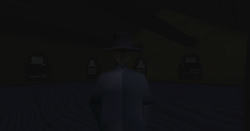 (Within the house stands a man. Is it a man? You can't really tell. The dark silouhette of his wide-brim hat and oversized trenchcoat are barely visible against the dark walls of the house.)
